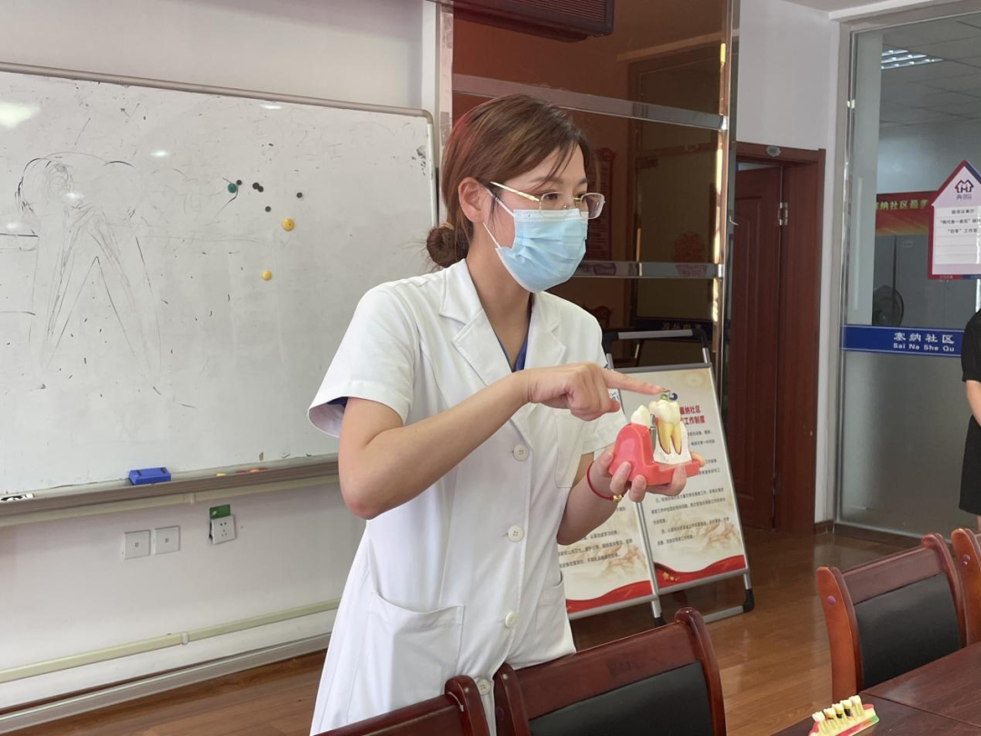 赵萌医生与社区居民分享“如何刷牙、选牙刷、选牙膏、假牙维护”等口腔健康小常识。在为居民检查牙齿的同时,向大家发放口腔健康方面的宣传资料,解答各种爱牙、护牙的专业问题。