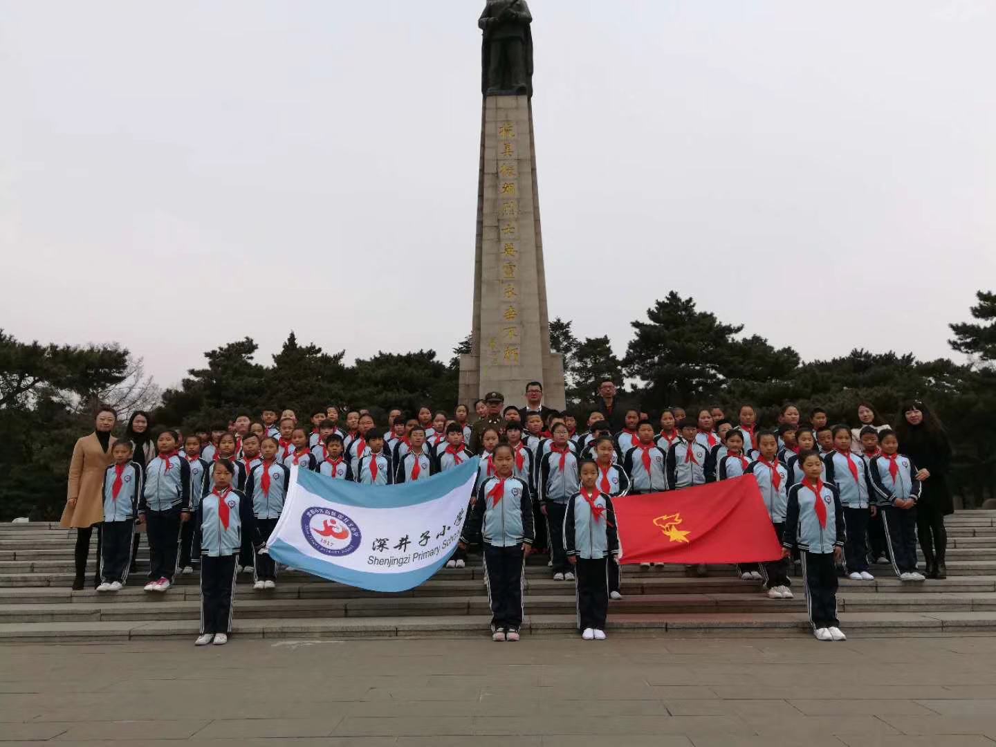 深井子小学的少先队员们到抗美援朝烈士纪念馆开展了“传承红色基因汇聚强军力量”主题活动,志愿军老战士为同学们讲解抗美援朝时期的革命活动,全体同学,集体瞻仰烈士陵园纪念碑、烈士名录墙,献花以表敬意,并在纪念碑前诵诗《红色基因代代传正当时代好少年》。