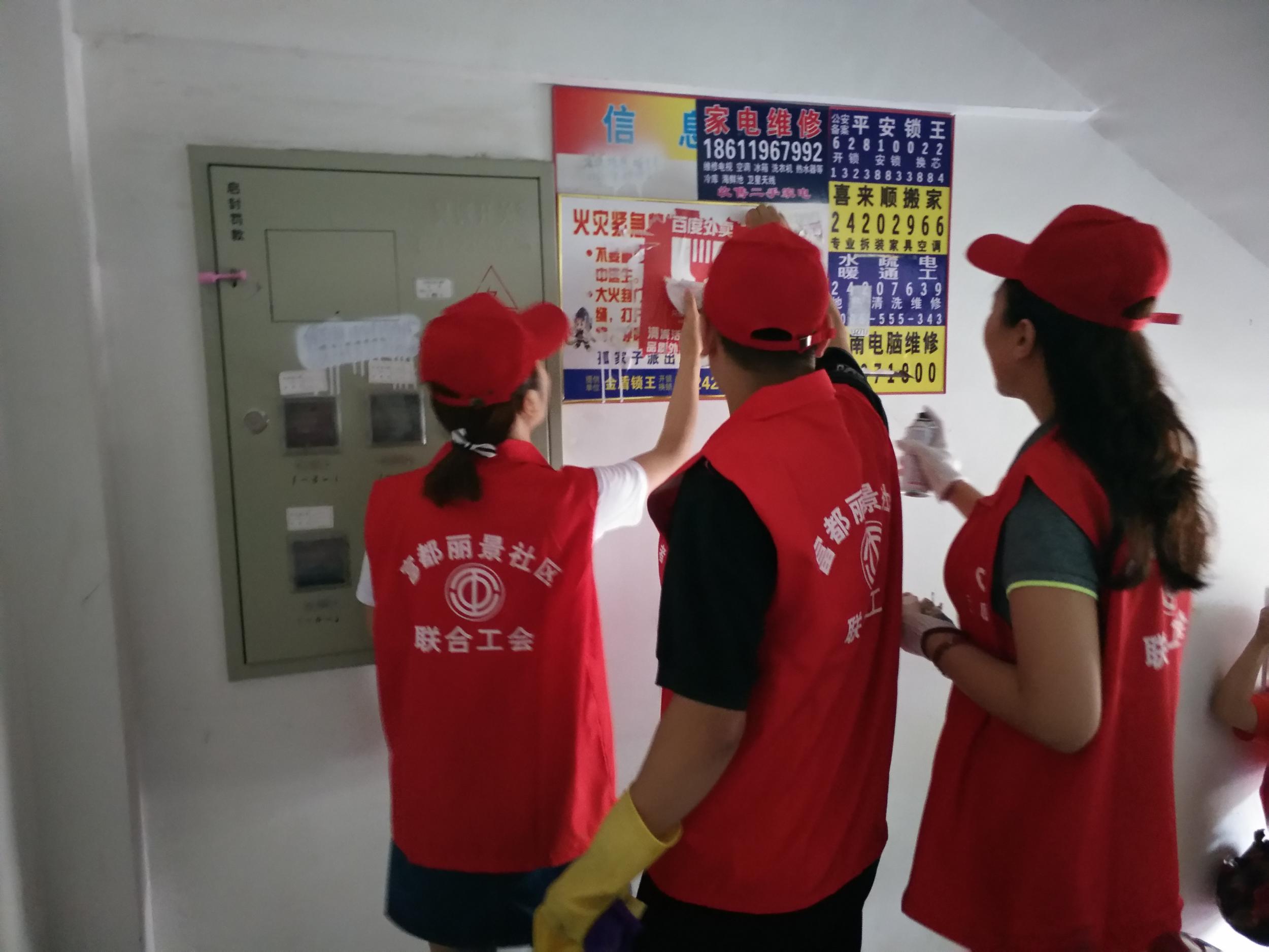 沈阳建筑大学外国语学院团队到富都丽景社区进行志愿服务。与社区党员、团员和工作者们共计35人共同清理了小区卫生死角、清除楼道杂物、清理小招贴等志愿服务。