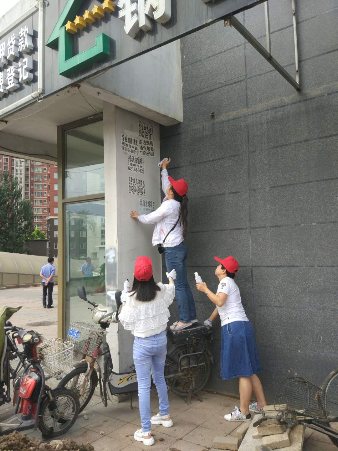 本次志愿服务活动的主要任务是清理辖区内外小招贴、公用区域堆积杂物以及垃圾死角。志愿者们在街道包保社区创城工作的征收科关家宏科长带领下拿着小铲子、喷涂工具、黑色垃圾袋走进小区和辖区内的卫生死角清理小广告、小招贴。志愿者们对易于清理的纸质招贴用手撕下来,对难清理的先用喷涂工具浸湿,再用铲子铲除,最大程度保护墙面整洁。志愿者们边清理边检查,尤其对小区围墙,公告栏、公共休闲区域等地方进行检查,将顽固的“牛皮癣”一一铲除,并对园区内的垃圾进行捡拾,此次共清理小招贴100余处,使小区环境焕然一新,美化了社区环境。