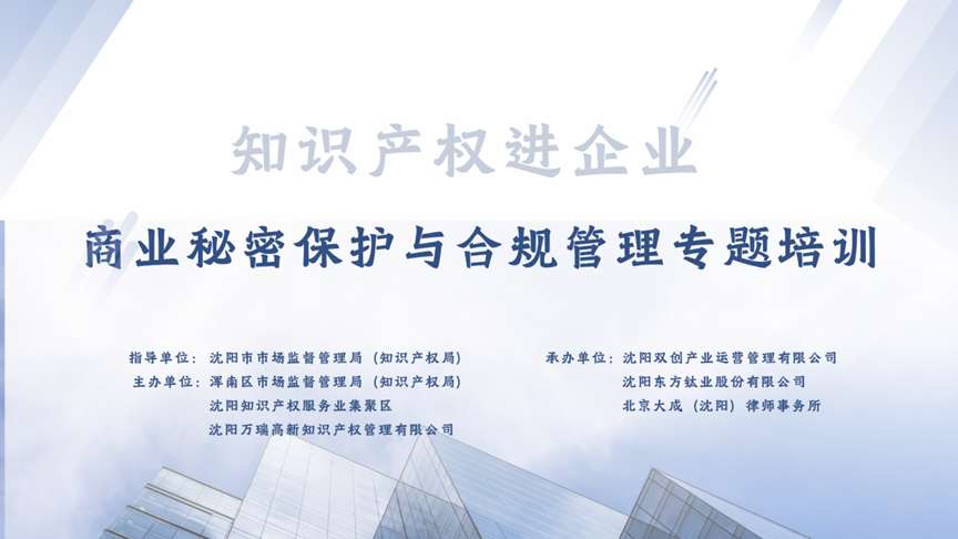 10月15日,沈阳知识产权服务业集聚区举办了“知识产权进企业”——商业秘密保护与合规管理专题培训活动。本次活动旨在让企业员工深刻认识到商业秘密作为企业核心资产的重要性,掌握有效的保护方法和合规管理措施,促进企业了解相关法律法规要求,规范内部管理,推动行业健康发展。本次活动由沈阳市市场监督管理局(知识产权局)指导,浑南区市场监督管理局(知识产权局)、沈阳知识产权服务业集聚区、沈阳万瑞高新知识产权管理有限公司主办,沈阳双创产业运营管理有限公司、沈阳东方钛业股份有限公司以及北京大成(沈阳)律师事务所承办。